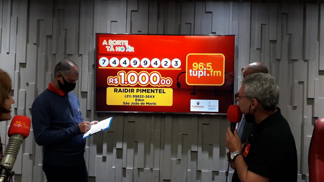 O primeiro sorteio desta terça-feira aconteceu às 12h30, no programa Patrulha da Cidade. Você confere em 96,5 FM, no site Tupi.FM, no aplicativo e no canal do YouTube da Super Rádio Tupi.