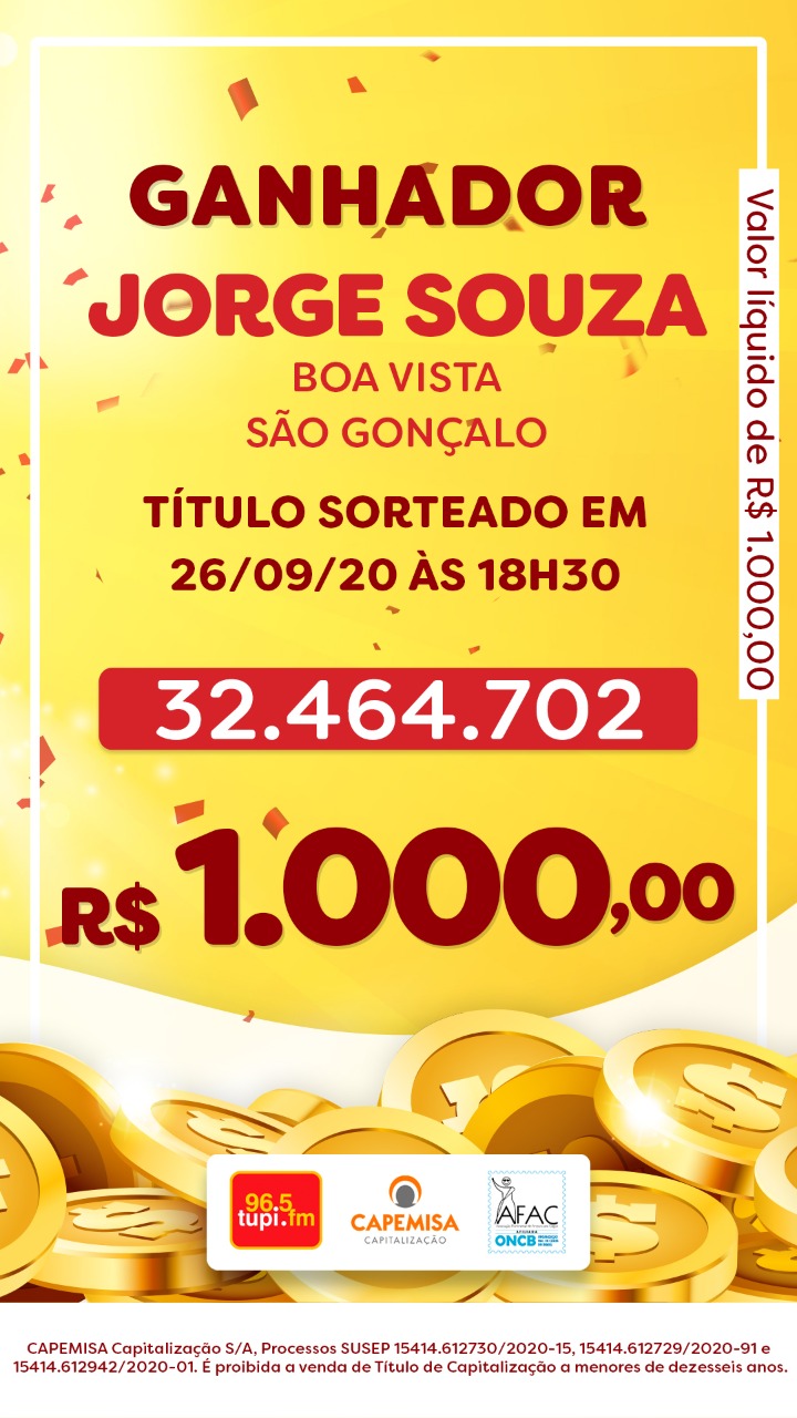 O segundo sorteio deste sábado, dia 26 de setembro, aconteceu às 18h30, dentro do Super Futebol Tupi. O ganhador foi Jorge Souza, morador do bairro Boa Vista, em São Gonçalo, na Região Metropolitana do Rio. Ele faturou R$ 1 mil. O número do título sorteado foi: 32.464.702.