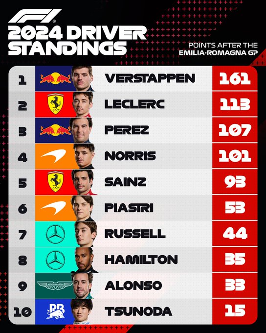 O tricampeão conquistou sua quinta vitória de 2024 e 59 vitórias na carreira. Com seu terceiro triunfo em Imola, ele se torna o segundo maior vencedor do circuito, igualando com Ayrton Senna e Alain Prost. Max segue liderando o campeonato com 161 pontos. A RBR lidera os construtores com 268 pontos, 56 a mais que a vice-líder Ferrari.