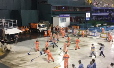 Após a forte chuva que atingiu a região do Centro do Rio, garis da Comlurb precisaram atuar na Marquês de Sapucaí. Diversos bolsões d’água se formaram...