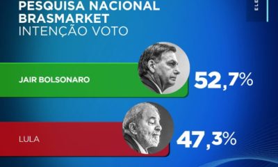 A nova pesquisa Brasmarket Inteligência em Pesquisa, divulgada nesta quinta-feira (20/10), aponta o presidente Jair Bolsonaro (PL) com 52,7% das intenções de votos válidos e o...