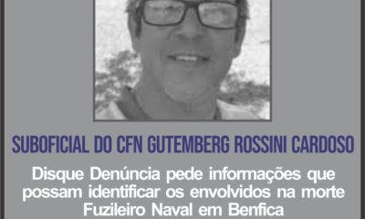 O Disque Denúncia divulgou um cartaz pedindo informações que levem à localização e prisão dos suspeitos envolvidos na morte do suboficial da Marinha Gutemberg Cardoso, de...