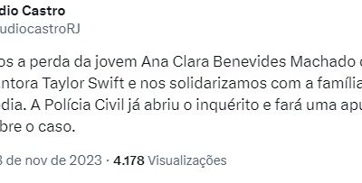 O governador Cláudio Castro (PL) usou as redes sociais para lamentar a morte de Ana Clara Benevides Machado, de 23 anos, no show da cantora norte-americana...