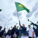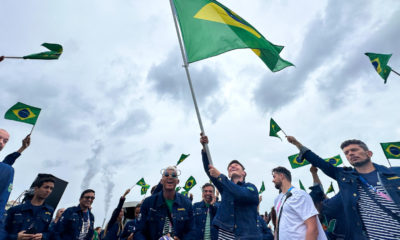Porta-bandeiras Isaquias Queiroz e Raquel Kochhann lideram embarcação na solenidade em Paris