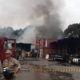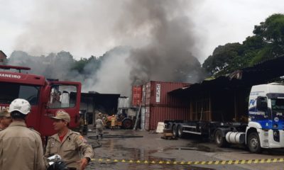 Bombeiros dos quartéis de Duque de Caxias, Nova Iguaçu e Irajá trabalham no rescaldo do incêndio que destruiu o galpão de luminárias localizado na Avenida Pistóia,...