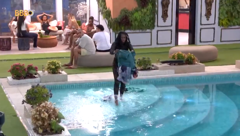 Bate-boca finalizado, cada um nos seus lugares, Leidy Elin foi até o Quarto Magia, onde Davi está e pegou a mala dele. A sister foi até o quintal e jogou toda a roupa do brother na piscina, enquanto Davi vê a cena e ri.
