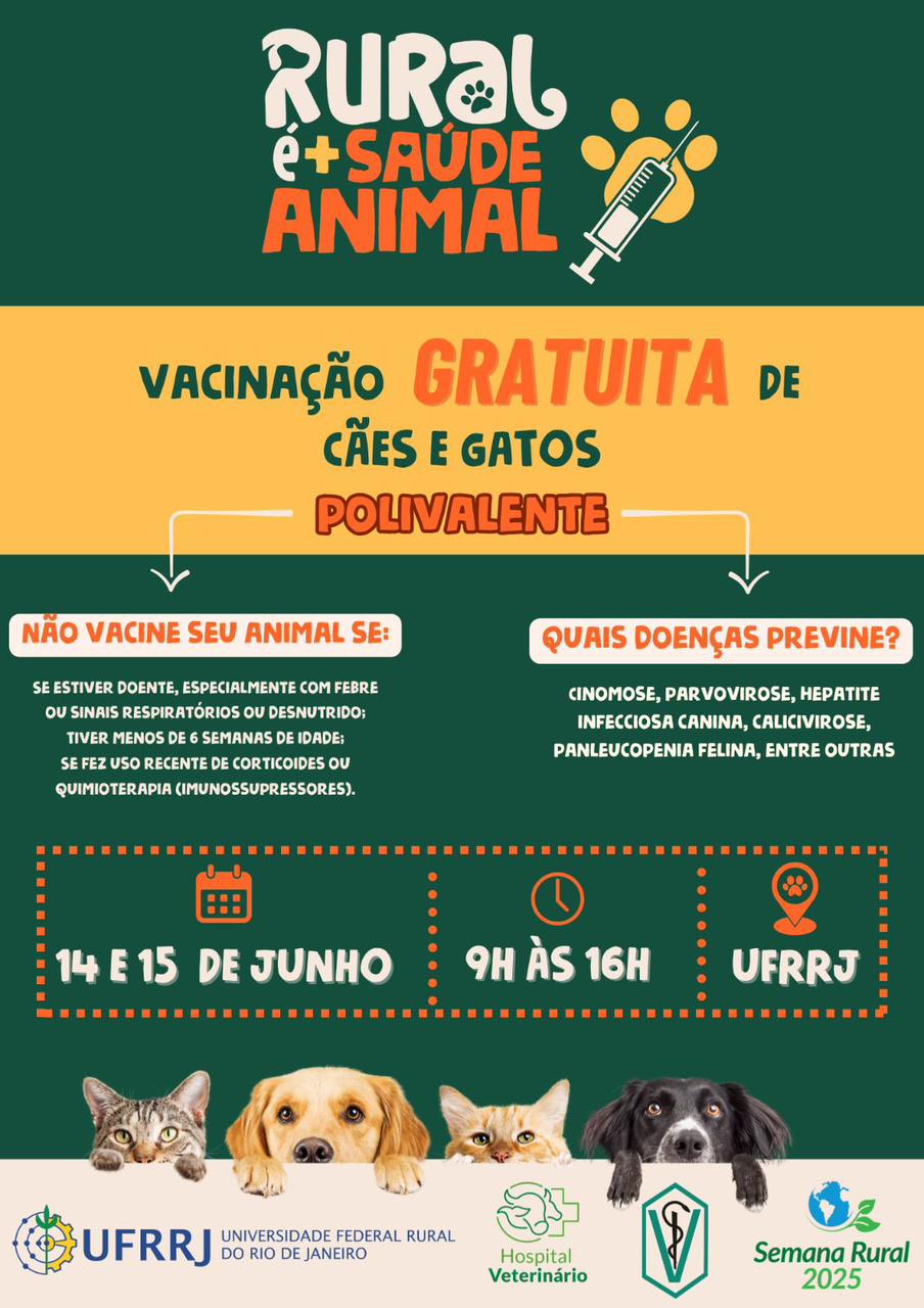 Tutores de cães e gatos poderão vacinar seus pets, neste fim de semana, gratuitamente no campus da Universidade Federal Rural do Rio de Janeiro (UFRRJ), em Seropédica. A iniciativa marca o pré-lançamento de um projeto financiado com recursos de emenda parlamentar do deputado federal Marcelo Queiroz. A ação vai imunizar mais de dois mil animais com as polivalentes V8 canina e V3 felina.