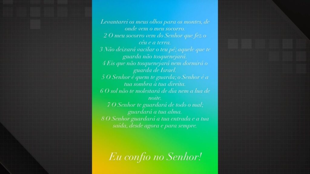 Na postagem, Michelle compartilhou a frase “Levantarei os meus olhos para os montes, de onde vem o meu socorro”. O conteúdo corresponde ao início do Salmo 121, que segue mencionando proteção divina e vigilância contínua.
