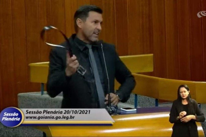Durante uma sessão plenária na Câmara Municipal de Goiânia, nesta quarta-feira (20), o vereador Sargento Novandir (Republicanos) ameaçou bater com um cinto em Geverson Abel (Avante). O vereador chegou a tirar o cinto da cintura e bater com ele em um mesa.
