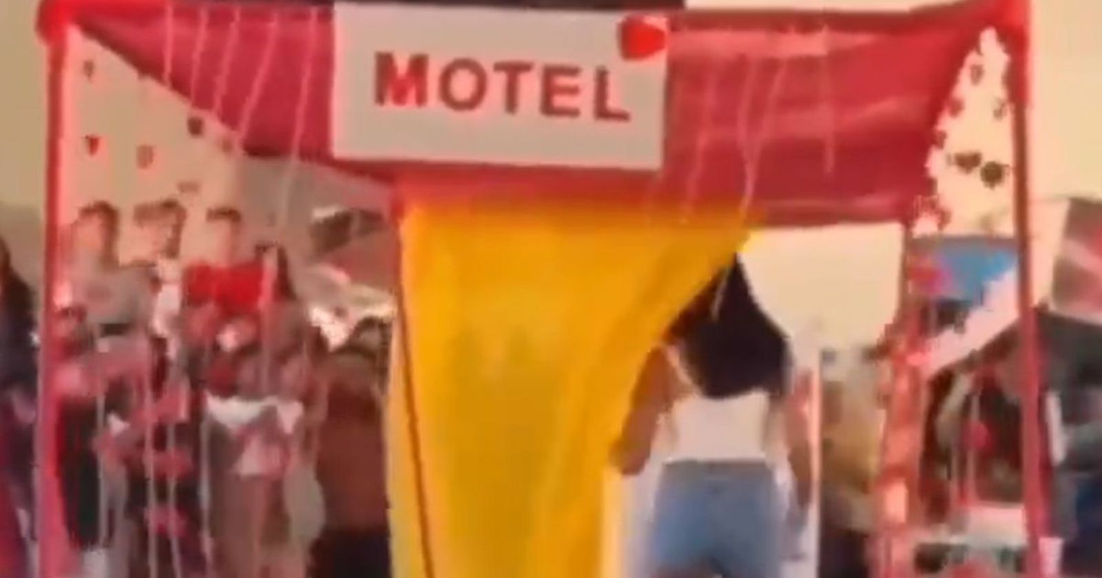Os estudantes — muitos deles menores de idade — aparecem dentro de uma barraca temática decorada como “motel”, onde realizam danças de conotação sensual. Em outro momento, uma aluna executa movimentos em torno de uma barra vertical, interagindo com colegas em simulações coreográficas. As cenas acontecem ao som de músicas em volume alto, sem registro visível da presença de professores ou responsáveis no momento.