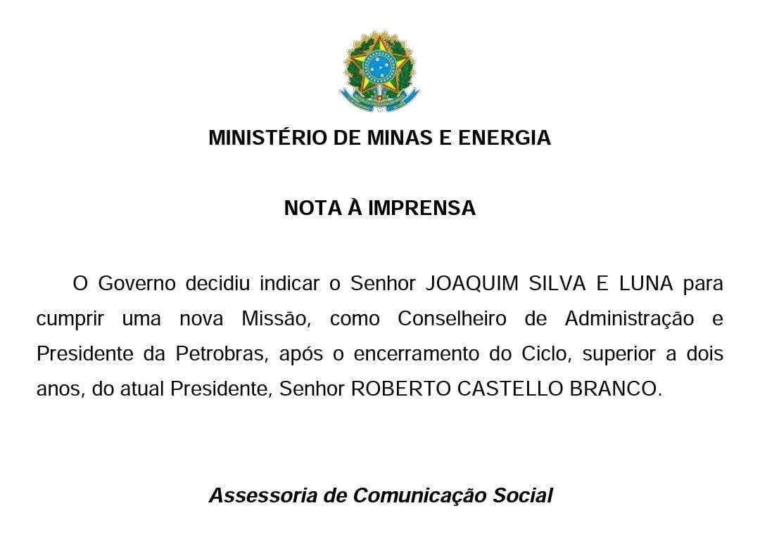 “O governo decidiu indicar o senhor Joaquim Silva e Luna para cumprir uma nova missão, como conselheiro de administração e presidente da Petrobras, após o encerramento do ciclo, superior a dois anos, do atual presidente, senhor Roberto Castello Branco”, diz a nota, assinada pela Assessoria de Comunicação Social do MME. Silva e Luna foi ministro da Defesa no governo Michel Temer e, desde janeiro de 2019, ocupa o cargo de diretor-geral da Itaipu Binacional, empresa pública dirigida pelos governos do Brasil e do Paraguai, responsável pela gestão da usina hidrelétrica.