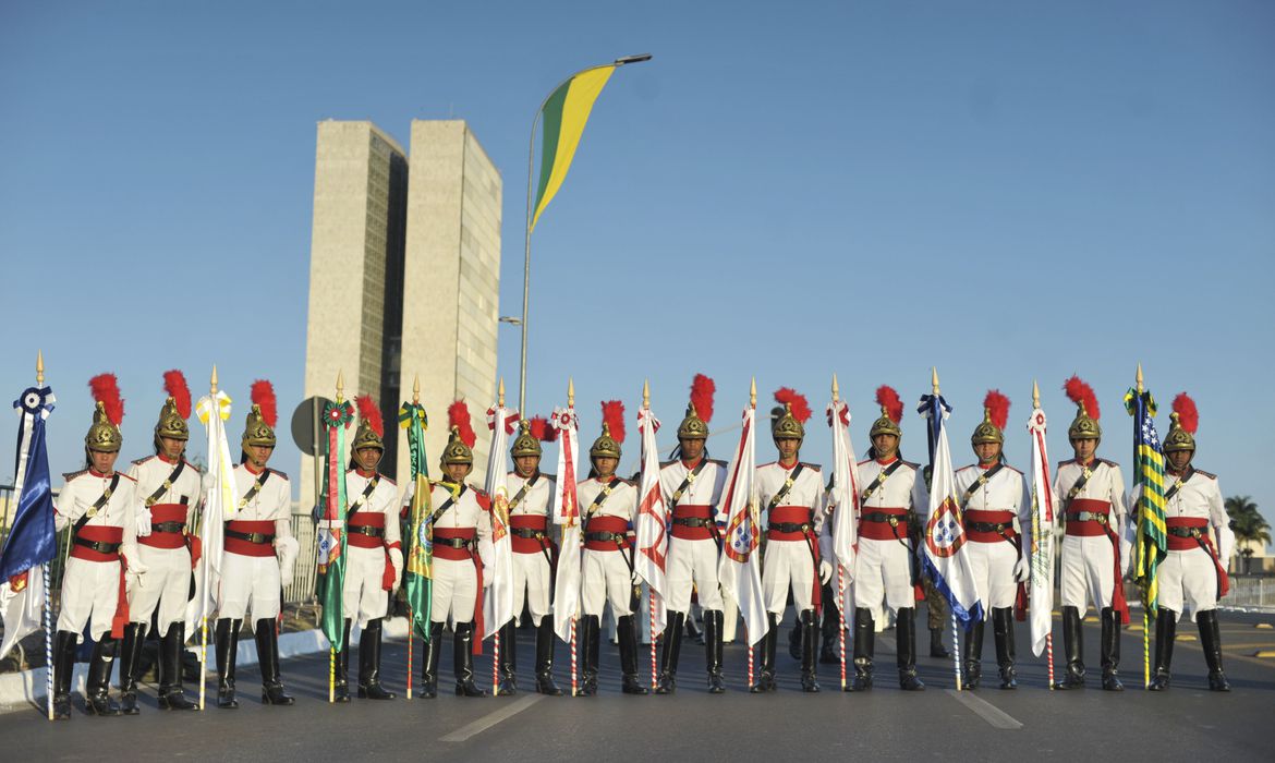 Centenas de pessoas participam do evento que tem a apresentação da esquadrilha da fumaça e a execução do Hino Nacional pela Banda do Batalhão da Guarda Presidencial.