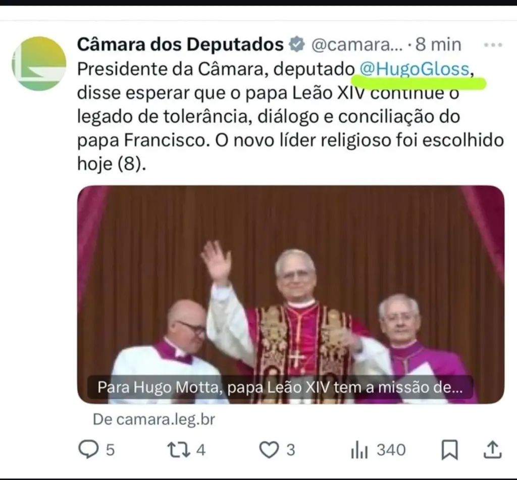 “O perfil oficial da Câmara no X marcou equivocadamente o influenciador Hugo Gloss, ao citar a nota do presidente da Câmara, Hugo Motta, a respeito do Papa Leão XIV. O post já foi corrigido. O erro ficou publicado das 15h45 às 16h02.”