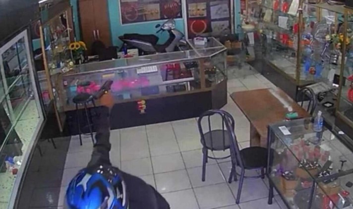 As imagens do sistema de segurança mostram o ladrão entrando no local armado e com um capacete para não ser identificado. Mas a mulher que está no balcão percebeu o que aconteceria, assim que o ladrão para na frente da loja, na garupa de uma moto.