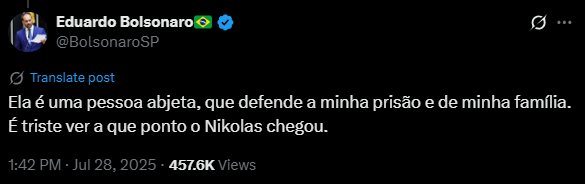 “É triste ver a que ponto o Nikolas chegou”, escreveu Eduardo, em resposta a uma publicação do influenciador bolsonarista Allan dos Santos, que está foragido da Justiça brasileira e vive atualmente nos Estados Unidos.
