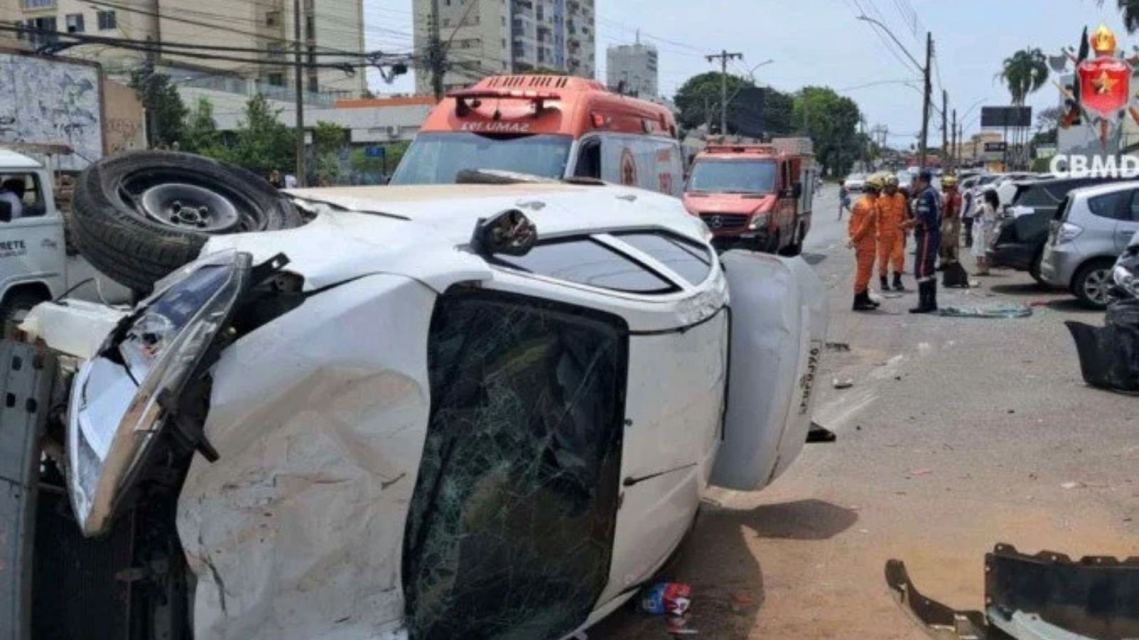 Acidente ocorreu na manhã deste sábado (1º/11). Segundo o Corpo de Bombeiros, a condutora de um Nissan Versa perdeu o controleNa manhã deste sábado (1º/11), uma colisão deixou cinco veículos danificados, dos quais um acabou tombando, na Avenida Samdu Sul, em Taguatinga. Segundo o Corpo de Bombeiros Militar do Distrito Federal (CBMDF), a condutora de um Nissan Versa branco perdeu o controle e acabou atingindo outros carros, tombando em seguida na frente de um poste de energia.
