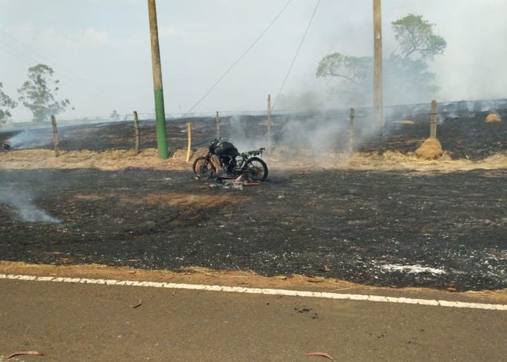 Carlos Roberto Joaquim, de 58 anos, resolveu parar a moto ao perceber que as chamas estavam se aproximando de uma propriedade rural e ajudar a retirar cabeças de gado que estavam no local. Porém, as chamam se alastraram tão rápido, que Carlos não conseguir salvar sua moto. O caso aconteceu na tarde da última quarta-feira (07).