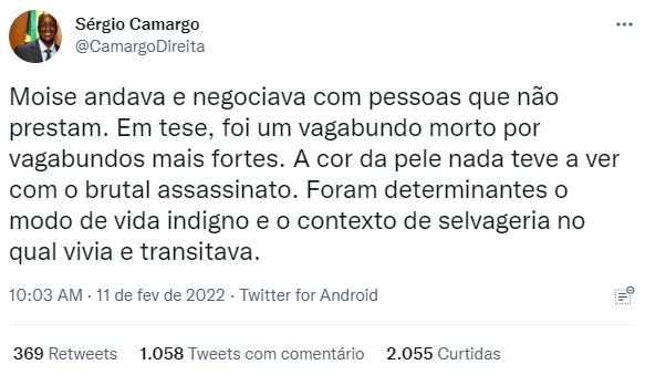 “O assassinato foi brutal, um ato de selvageria que precisa ser punido exemplarmente. Isso, porém, não faz do congolês Moise um “herói dos negros”, nem mártir da “causa antirracismo” no Brasil. Não importa se a esquerda fica enfurecida e histérica. A verdade precisa ser dita”, comentou Sérgio Camargo em outra publicação.