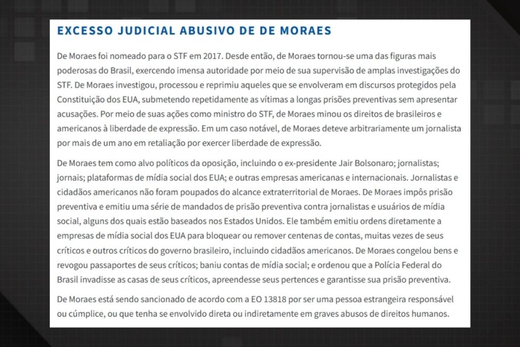 No caso brasileiro, é a primeira vez que um membro do STF é diretamente atingido pela legislação. O Departamento de Justiça americano também havia questionado a validade de decisões judiciais de Moraes contra plataformas digitais com sede nos EUA.