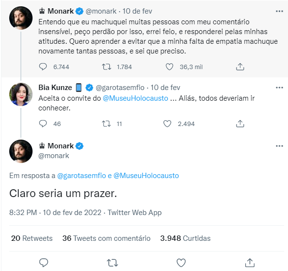 Monark aceitou o convite para conhecer o Museu do Holocausto de Curitiba, após ser demitido do ‘Flow Podcast’ por defender a existência de um partido nazista, o que é proibido por lei.