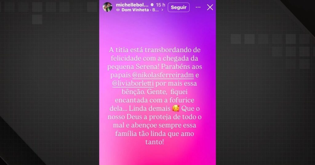 Na postagem, Michelle desejou benção e proteção para a família e disse estar muito contente com a novidade “A titia está transbordando de felicidade com a chegada da pequena Serena! Parabéns aos papais… Fiquei encantando com a fofurice dela” disse a primeira dama nas redes sociais.