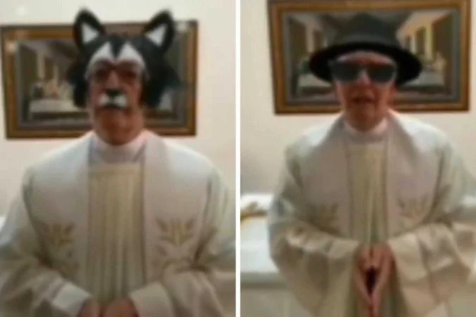 No vídeo viral, o padre conduzia a celebração de casa, mas, sem notar, ativa uma sequência de filtros enquanto ele profere as orações. São filtros de gatinho, de corredor e de chapéu com óculos escuros, que contrastam com a seriedade da missa.