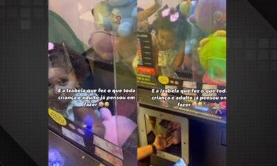 Uma menina de apenas 3 anos protagonizou uma cena inusitada e digna de vídeo viral: Izabela conseguiu entrar dentro de uma máquina de pelúcias em um...