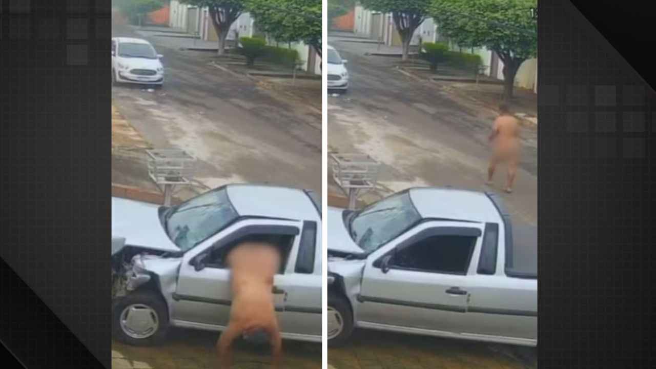 Peladão em fuga: homem rouba carro, bate em muro e foge sem roupas