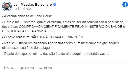 “Presidente, a China é uma ditadura, não compre essa vacina, por favor. Eu só tenho 17 anos e quero ter um futuro, mas sem interferência da Ditadura chinesa”, comentou um internauta. O presidente respondeu: “NÃO SERÁ COMPRADA”.
