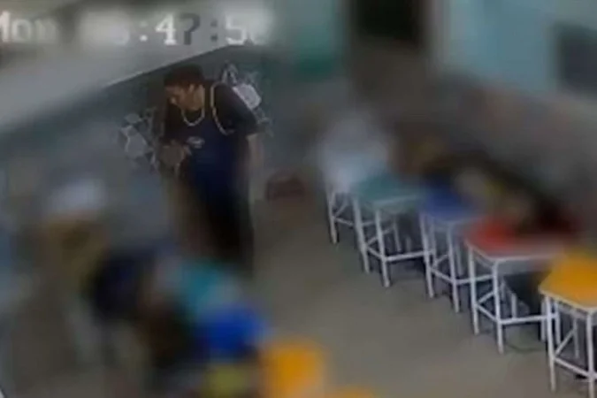 Câmera de segurança da escola registrou o momento em que a professora aparece gritando com o menino e depois o atinge com uma pilha de livros