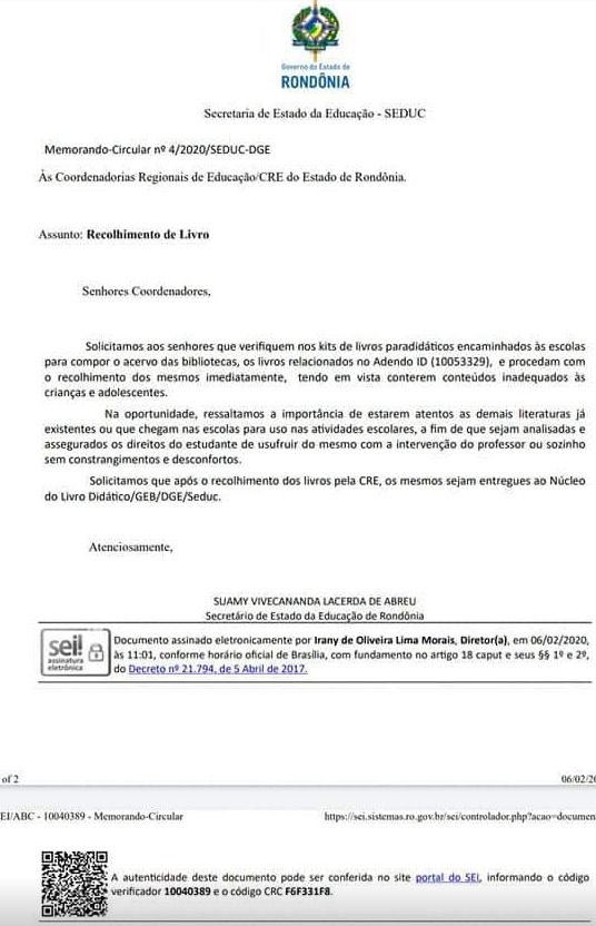 No documento, a secretaria enfatizou ainda importância dos professores “estarem atentos as demais literaturas já existentes ou que chegam nas escolas para uso de atividades escolares”, de modo “que sejam analisadas e assegurados os direitos do estudante de usufruir do mesmo com a intervenção do professor ou sozinho sem constrangimento e desconfortos”.