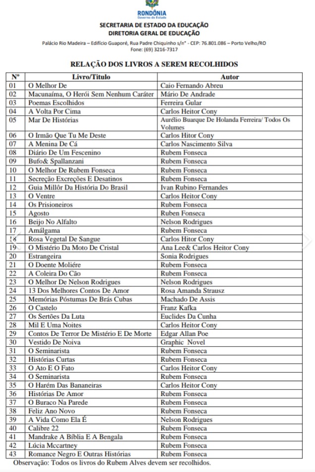 A secretaria de Educação de Rondônia determinou, na última quinta-feira, que fossem recolhidos, pelas coordenadorias regionais do estado, dezenas de livros das bibliotecas das escolas, incluindo clássicos da literatura brasileira como “Os Sertões”, “Memórias Póstumas de Brás Cubas”, “Agosto” e “Macunaíma”. Ao todo, a relação contém 43 publicações. A justificativa seria de que as obras contém “conteúdos inadequados para crianças e adolescentes”.