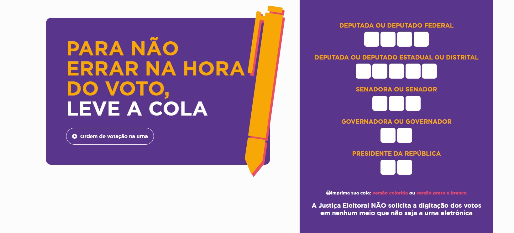 Com a proibição do uso de celular na cabine no momento da votação, eleitores poderão levar a chamada “cola eleitoral”. No portal do Tribunal Superior Eleitoral (TSE), há uma cola para o eleitor imprimir e preencher com os números dos candidatos nos quais pretende votar.