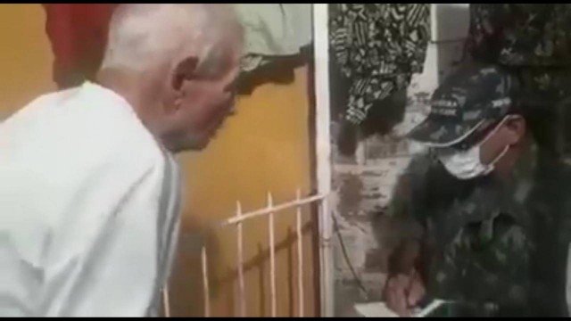 Um rapaz se disfarçou de soldado do Exército para manter o pai idoso isolado dentro de casa durante a quarentena, em razão da pandemia do novo coronavírus. O vídeo foi filmado por uma pessoa no interior da residência e compartilhado no Facebook na noite de quinta-feira.
