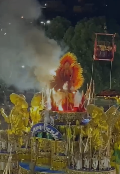De acordo com os bombeiros, a alegoria teve dois picos de fogo. O primeiro foi controlado antes da entrada. Logo depois, praticamente na entrada, o fogo voltou e houve correria novamente.