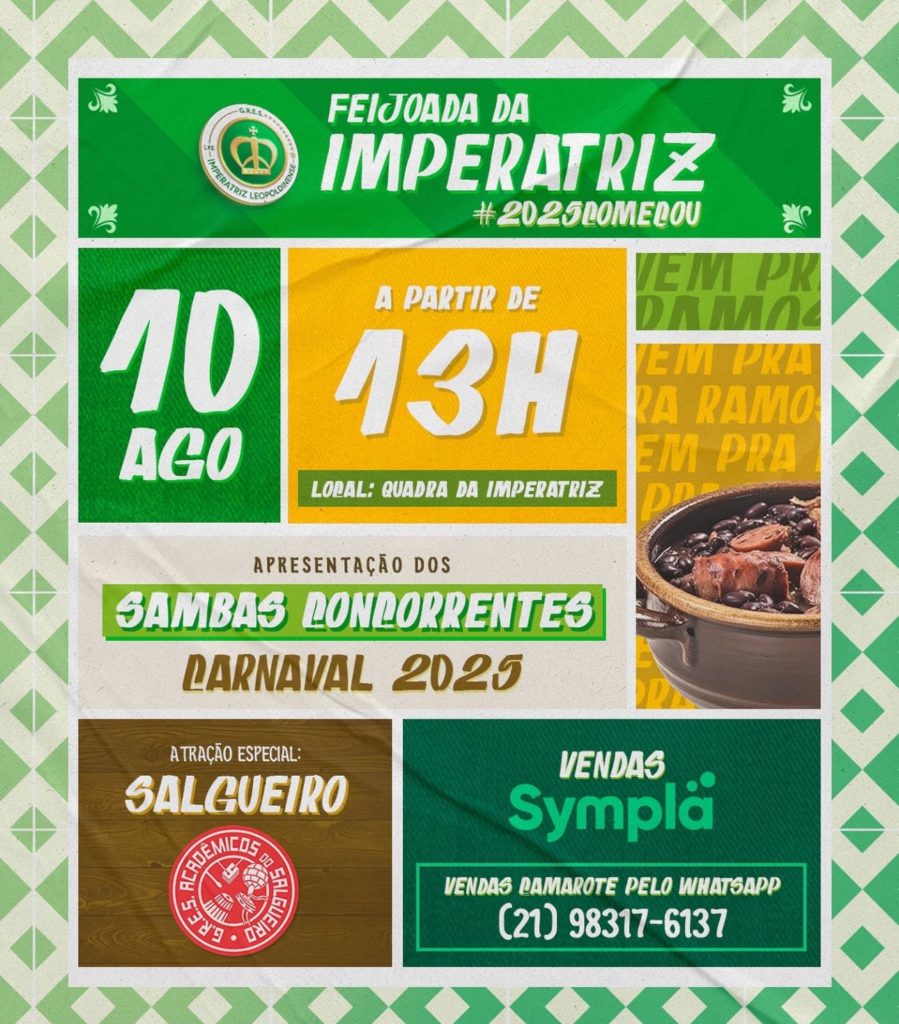 Em mais uma edição de sua tradicional feijoada, a Imperatriz Leopoldinense, atual vice-campeã do Carnaval carioca, abre as portas da quadra da escola, em Ramos, no dia 10/08 (sábado), para receber a coirmã Acadêmicos do Salgueiro.