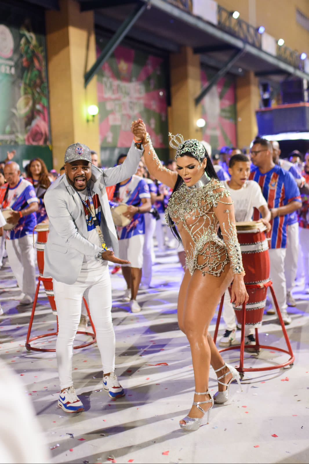 A empresária, que pelo terceiro ano consecutivo brilhará à frente da Baterilha comandada pelo mestre Marcelo Santos, desfilou sob aplausos e gritos dos presentes que eram só elogios a beleza da Majestade: