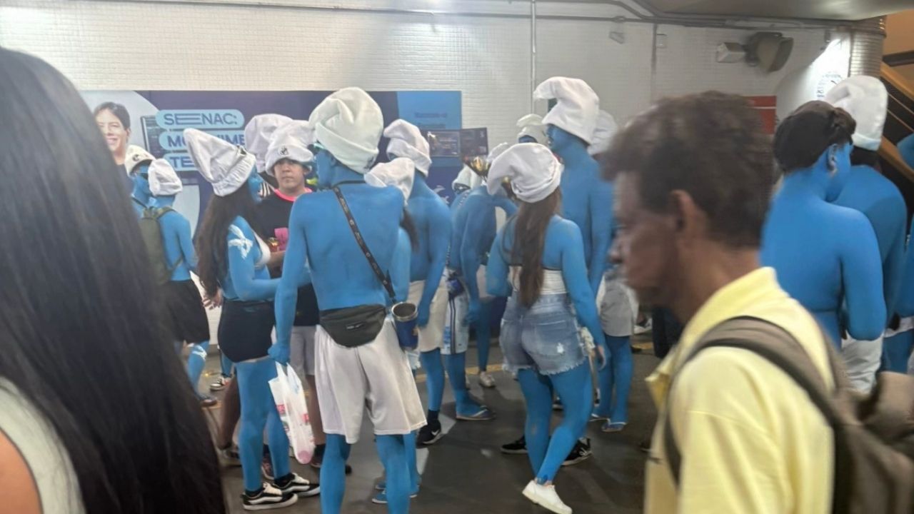 Um grupo de foliões fantasiados de Smurfs tomou um vagão do metrô de Belo Horizonte durante o Carnaval. No vídeo que circulou nas redes sociais, os passageiros aparecem com o corpo todo pintado de azul e usando gorros brancos, mantendo a caracterização completa durante o trajeto.