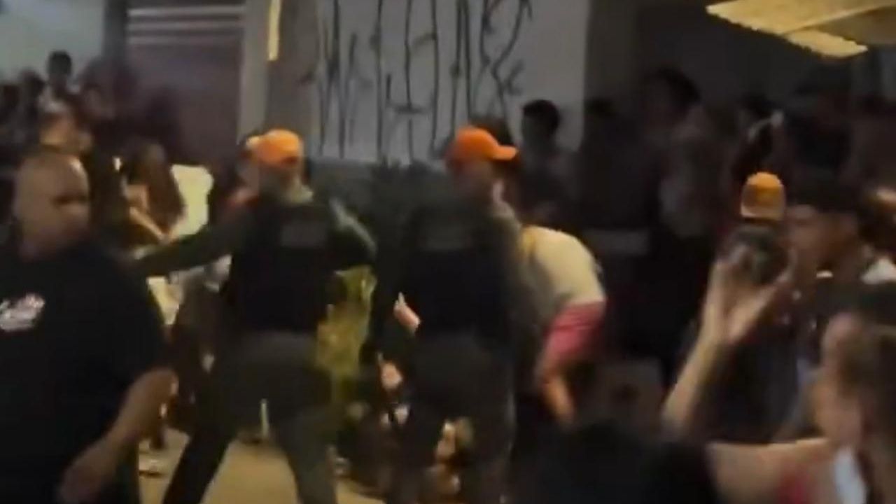 As imagens registram pessoas correndo e tentando se proteger. Em alguns momentos, foliões aparecem prendendo a respiração. Também é possível ver policiais militares chutando participantes e utilizando cassetetes durante a dispersão.
