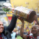 Uma das cenas mais simbólicas no desembarque de clubes após grandes conquistas, a taça do tri da Libertadores foi vista pela primeira vez em solo brasileiro...