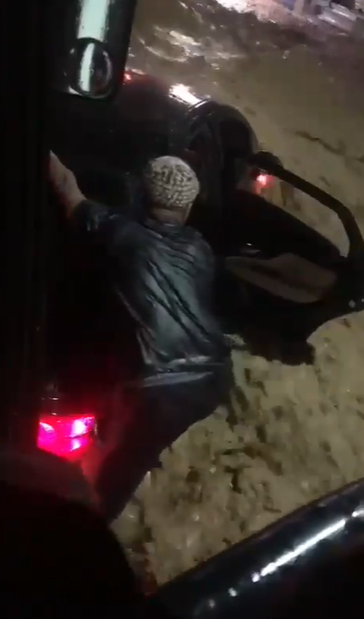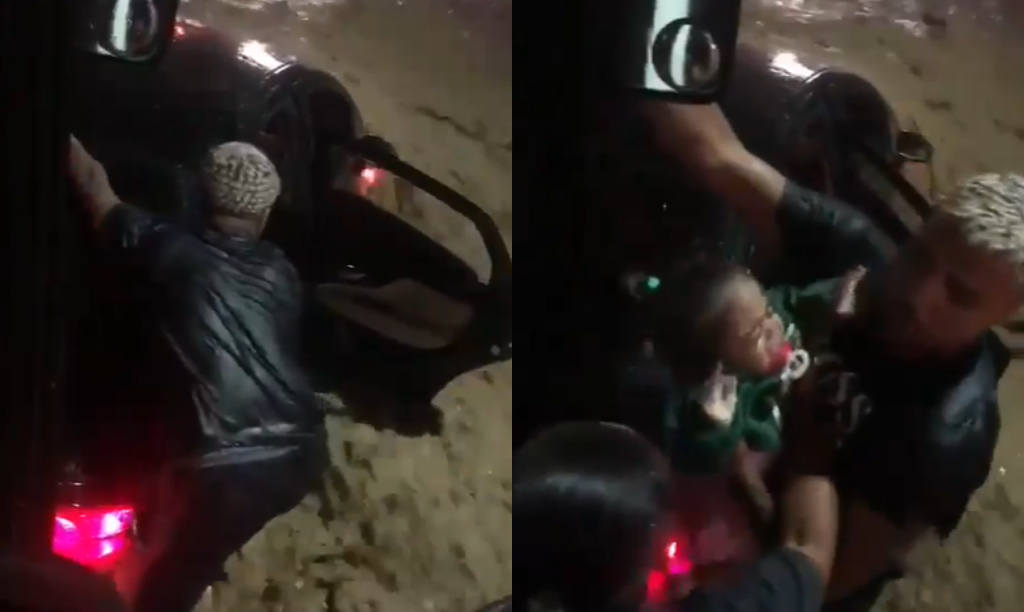 Nos vídeos que flagraram o momento, é possível ver o jovem, identificado como Marcos Vinicius, dentro de um ônibus e se esticando para buscar as crianças no carro. Posteriormente, ele também resgata uma mulher. Logo em seguida o carro vai embora na enxurrada.