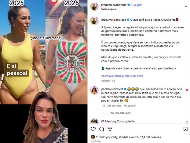 Paolla Oliveira respondeu um vídeo que circula nas redes sociais sobre sua região íntima. Nele, a cirurgiã plástica Pamella Andrade compara imagens da atriz usando maiô, dando um destaque para a região pélvica, sugerindo uma transformação no Monte de Vênus. A médica usa o exemplo de Paolla para falar sobre lipoaspiração, que ajuda a reduzir gordura localizada e melhorar o contorno da região.