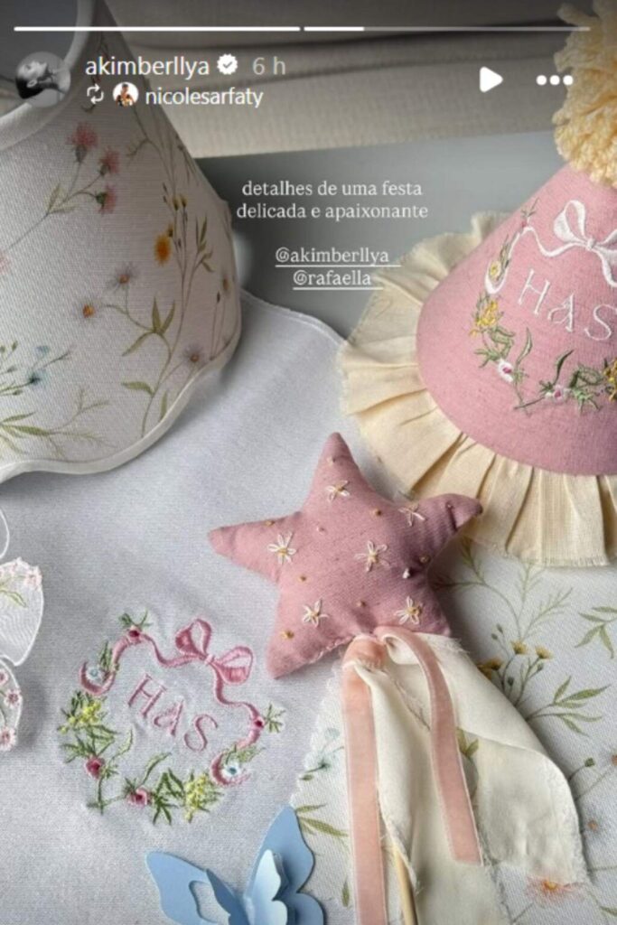Na véspera do aniversário de 1 ano de Helena, Amanda Kimberlly deu uma prévia da festa especial que prepara para a filha com Neymar. A influenciadora usou as redes sociais para compartilhar detalhes da decoração, repostando uma publicação da decoradora Nicole Sarfaty. “Detalhes de uma festa delicada e apaixonante”, escreveu Nicole, ao mostrar elementos que compõem o cenário: flores, estrelas e borboletas em tons claros de rosa, azul, branco, verde e amarelo.