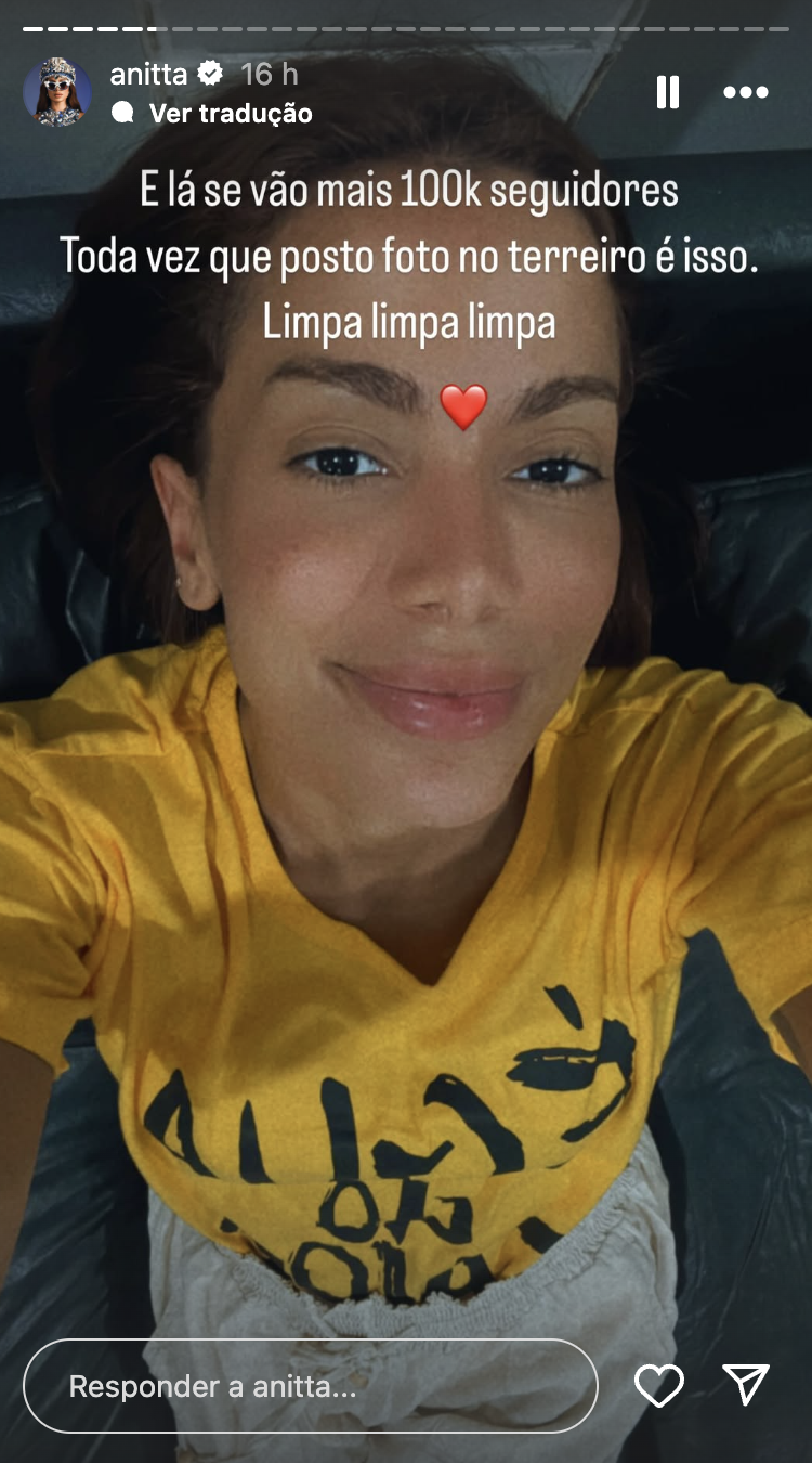 “E lá se vão 100 mil seguidores. Toda vez que posto foto no terreiro é isso. Limpa, limpa, limpa”, escreveu Anitta em tom irônico.