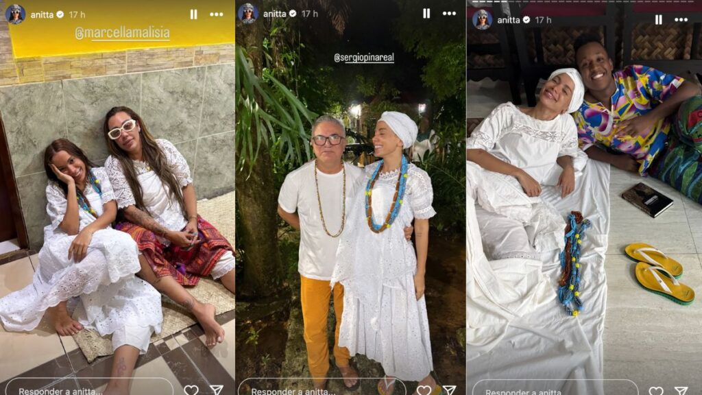 Nas imagens divulgadas em seu perfil no Instagram, a cantora aparece vestida de branco ao lado de seu pai de santo, Sergio Pina, no terreiro que frequenta em Nova Iguaçu, na Baixada Fluminense. Anitta segue o candomblé desde 2013 e costuma visitar o local acompanhada de sua família.