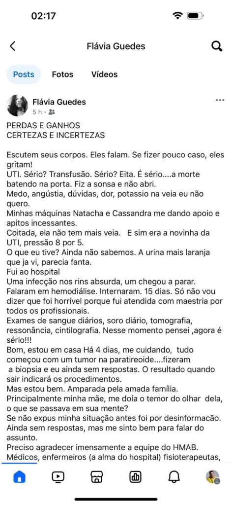 Já em casa, Flávia fez questão de agradecer aos profissionais do Hospital das Forças Armadas (HMAB) e celebrou a esperança. “Médicos, enfermeiros, fisioterapeutas, técnicos, limpeza… fui atendida com maestria. A Deus, que não abandona, minha fé está firme. Logo trarei novidades”, disse. Agora, ela segue com o acompanhamento de um clínico, cirurgião, endócrino, oncologista e nefrologista. “Andar com fé eu vou, a fé não costuma falhar”, finalizou.