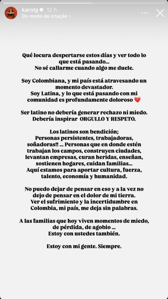“Que loucura acordar esses dias e ver tudo o que está acontecendo… Não sei me calar quando algo me dói”, escreveu a cantora, visivelmente abalada com os acontecimentos recentes. Karol seguiu abrindo o coração: “Sou colombiana, e meu país está passando por um momento devastador. Sou latina, e o que está acontecendo com a minha comunidade é profundamente doloroso.”
