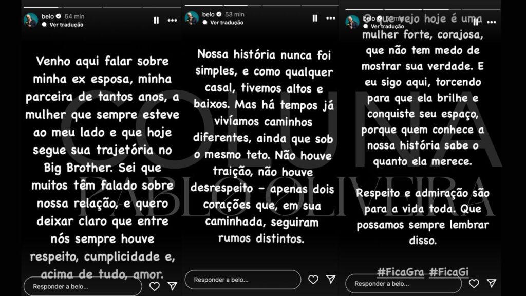 Belo, que foi casado com Gracyanne por mais de uma década, fez questão de exaltar a trajetória da musa fitness e expressar seu apoio incondicional, mesmo após o término: “Venho aqui falar sobre minha ex-esposa, minha parceira de tantos anos, a mulher que sempre esteve ao meu lado e que hoje segue sua trajetória no Big Brother. Sei que muitos têm falado sobre nossa relação, e quero deixar claro que entre nós sempre houve respeito, cumplicidade e, acima de tudo, amor”, declarou.