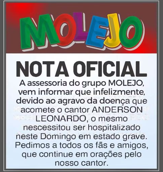 “A assessoria do grupo MOLEJO, vem informar que infelizmente, devido ao agravo da doença que acomete o cantor ANDERSON LEONARDO, o mesmo necessitou ser hospitalizado neste Domingo em estado grave. Pedimos a todos os fãs e amigos, que continue em orações pelo nosso cantor”, dizia o comunicado.