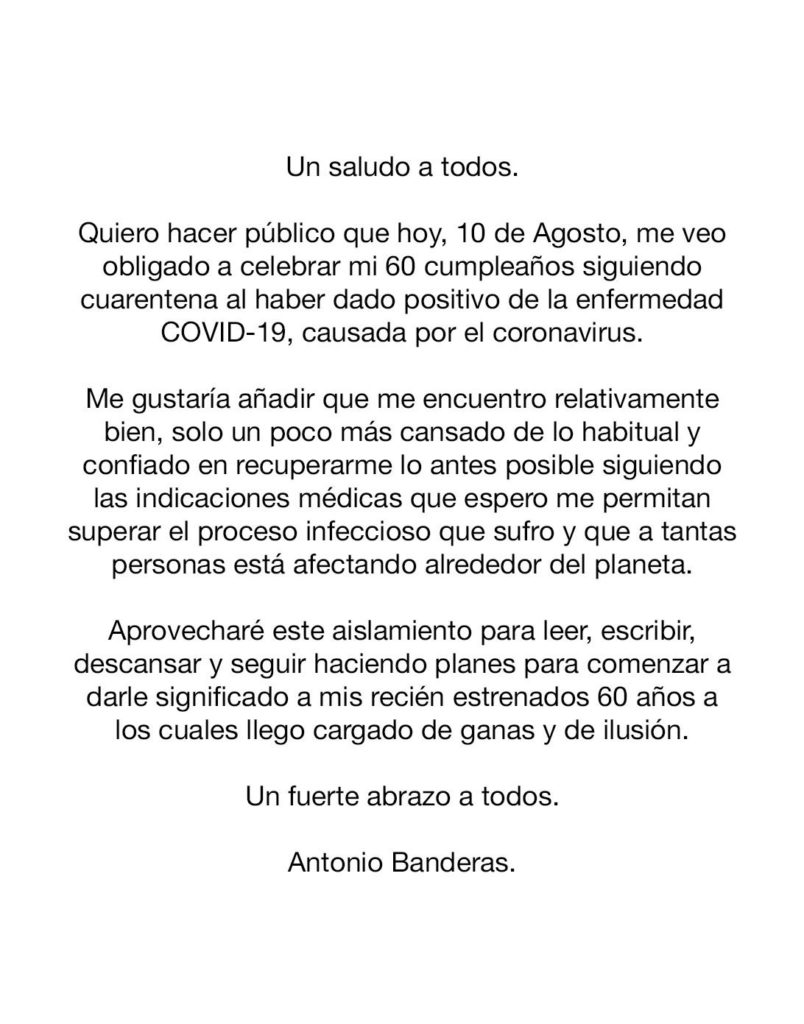 O espanhol postou uma mensagem no Twitter falando da situação e confirmou que foi infectado pela doença. “Quero revelar publicamente que hoje, 10 de agosto, me vejo obrigado a celebrar meus 60 anos seguindo de quarentena ao ter dado positivo para a covid-19, enfermidade causada pelo coronavírus”, escreveu o ator.